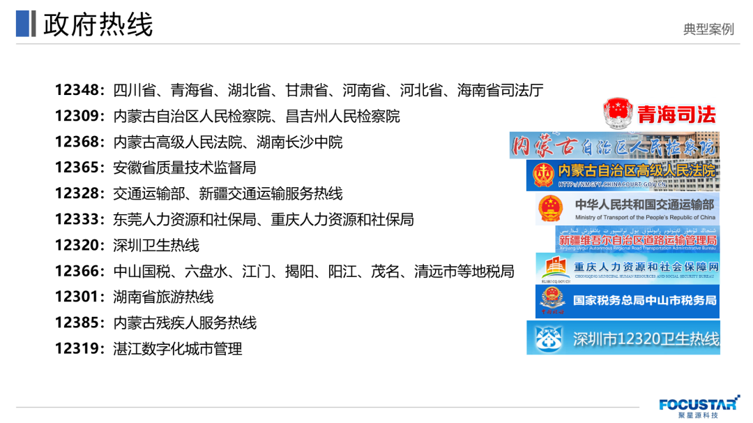 其中智慧政務服務熱線項目,聚星源12309檢察熱線系統(tǒng)已成功部署于內(nèi)蒙古、新疆昌吉等地檢察院;12348司法熱線系統(tǒng)成功部署于四川、青海、湖北、甘肅、河南、河北、海南等省司法廳及地市司法局;同時,其12328交通服務熱線系統(tǒng)、12368法務熱線、12333人力資源和社保局熱線、12366稅務局熱線等系統(tǒng)也已服務于各地政務機關單位,持續(xù)為各地政務機關全方位提升數(shù)字化治理能力,成為政務機關與百姓群眾溝通的橋梁。